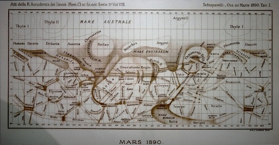 Die wohl spektakulärsten Marszeichnungen fertige der farbenblinde Giovanni Schiaparelli bei der Marsopposition des Jahres 1877 in Mailand an. An der Auflösungsgrenze seines Teleskops arbeitend, verband sein Auge zarte Flecken zu Linien. Schiaparelli sprach von canali und schloss nicht aus, hier künstliche Bauwerke zu sehen.