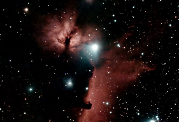 Nahe Alnitak, dem linken Gürtelstern, verstecken sich zwei grandiose Emissionsnebel, NGC 2024 und IC 434. Ein Dunkelnebel zerzupft den NGC 2024 (Flammennebel). Eine andere dunkle Wolke ragt in den Emissionsnebel IC 434 hinein, als wollte sie den Hals und Kopf eines Pferdes zeichnen (Pferdekopfnebel).