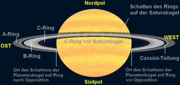 Auf der südlicheren Seite des Rings zeichnet sich ein etwas breiterer, grauer Bereich ab. Man könnte ihn leicht mit einem Ringschatten verwechseln. Tatsächlich handelt es sich hier aber um den C-Ring selbst. Auch das illustriert die obige Grafik.