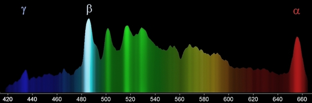 Sterne (hier das Spektrum der Wega) senden Licht aller Farben aus und erscheinen daher primär weiß