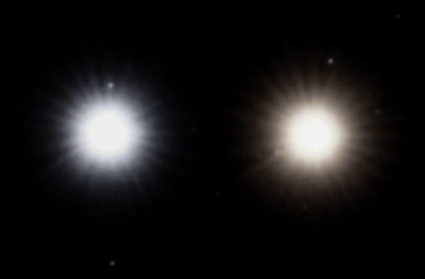 Sternfarben, langbelichtet im Teleskop: Links Sirius, rechts Beteigeuze.