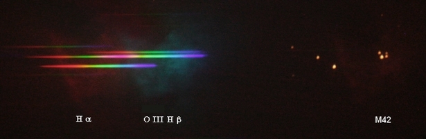 Durch ein Spektralgitter fotografiert, bildet sich der Orionnebel (ganz rechts) mehrfach ab - je nach Emission etwas weiter links
