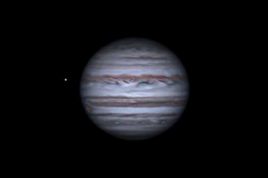 Anders als die Monde selbst sind deren schwarze, winzige Schatten auf dem Jupiterscheibchen recht gut im Amateurteleskop zu sehen. Ein Beispiel für einen solchen Schattenwurf sahen Sie auf dem Foto oben (nahe der Bildmitte).