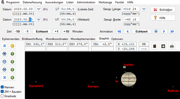Das kostenlose Programm (Screenshot oben) stellt u.a. die Jupitermondpositionen (Programm / Himmelskörper / Jupiter / Werkzeuge / Ephemeridenberechnung) dar, inklusive Tranits und Schattenwürfe. Zoomen Sie heraus, um die Monde zu sehen (Website und Download)