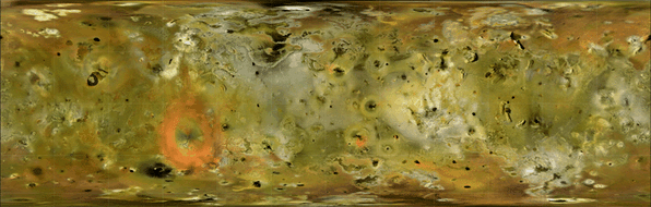 Die Monde der äußeren Planeten sind mit vergleichsweise farbneutralem Eis bedeckt. Doch Ios Körper wird beim flinken Umlauf um Jupiter von Gezeitenkräften "durchgeknetet". Sie erbricht heiße silikatische Lava an die Oberfläche. Der darin enthaltene Schwefel sorgt für Farbreichtum. Gelb, Gelbgrün und Olivgrün gesellen sich zu Orangetönen.