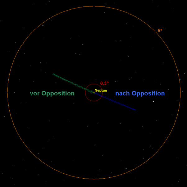 Neptun zum Oppositionstermin 2026 im (nicht umkehrenden) Fernrohr, Bewegung in Tagesschritten. Bildfeld: 0,5 Grad
