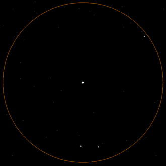 So etwa muss Galileo Galilei den Jupiter, dessen Monde und den Neptun am 28. Dezember 1612 in Florenz gesehen haben. Der innerste Mond Io weilt gerade vor der Jupiterscheibe und ist daher nicht zu erspähen. Neptun steht hier ganz links unten. Das tatsächliche Gesichtsfeld von Galileis Teleskop war um ein Drittel kleiner: Er konnte die hier dargestellten Objekte also nicht gleichzeitig sehen!