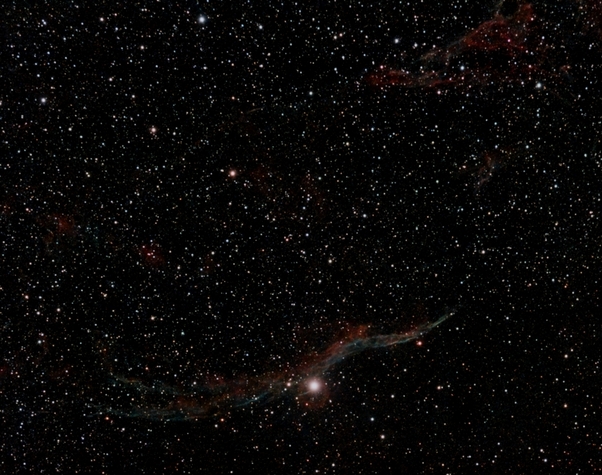 Der westliche Teil des Schleiernebels liegt dem zuvor beschriebenen gleichsam gegenüber. Er schimmert allerdings etwas weniger. Der Stern 52 Cygni (4,2 mag) teilt den Nebelbogen in einen helleren nördlichen und einen schwächeren südlichen Abschnitt. Der südliche teilt sich letztlich in zwei oder mehr Bögen auf (links auf meinem Foto).