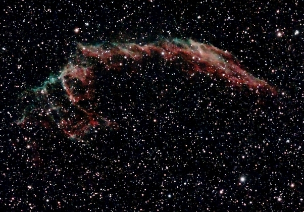 Dieser östliche Abschnitt des Schleiernebels sieht recht gespenstisch aus (siehe Foto oben), wie ein Geistergesicht oder ein lachender Totenkopf im Profil. Der südlich anschließende IC 1340 bildet gewissermaßen den "Unterkiefer", der NGC 6992 die hohe "Stirn des Kopfes".Da ich den Cirrus-Nebel selbst standortbedingt noch nie sah, wohl aber fotografierte, halte ich mich hier an die Beschreibung von Ronald Stoyan.Er nennt diesen Abschnitt in seinem sehr empfehlenswerten Deep Sky Reiseführer NGC 6992/5 (das entspricht "Gesicht" und "Stirn" in meinem Bild). Demnach ist dieser Abschnitt unter wirklich dunklem Himmel bereits mit einem Fernglas sichtbar. Für das Teleskop empfiehlt Stoyan hier Weitwinkelokulare mit minimaler Vergrößerung. Ein zwei- bis vierzölliges Teleskop (5 bis 10 cm Öffnung) soll reichen.Ein OIII-Linienfilter (sprich: "O3") lässt fast nur das Licht des zweifach ionisierten Sauerstoffs (496, 501 nm) durch. Dieses grün anmutende Interferenzfilter erhöht den Kontrast deutlich. Damit ist laut Stoyan im Sechszöller (15 cm Öffnung) auch der IC 1340 (den ich oben "Unterkiefer" nannte) erkennbar.