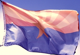 Für den Sonnenuntergang stehen die roten und gelben Strahlen in der Flagge Arizonas (Foto links oben). Die Flagge New Mexicos (Foto links) zeigt zwar ein sternähnliches Symbol - doch das ist in Wirklichkeit die Sonne des indianischen Zia-Volks.