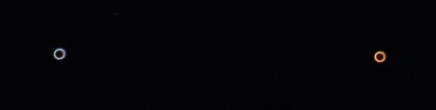 Sternfarben, langbelichtet im Teleskop: Links Sirius, rechts Beteigeuze.