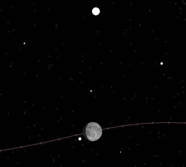 Stündliche Bewegung des Mondes: Die hier gekrümmte Bahnform ist der Projektion geschuldet